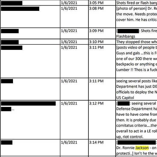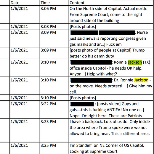 As well, the messages refer to Trump advisor Roger Stone and to Representative Ronny Jackson (R-TX), at the time the newly elected representative who had been the White House physician. “Roger Stone just asked for security,” Jessica Watkins texted the group chat on January 1, referring to a statement Stone had made on television. Another answered: “Who reached out to you? I [spoke] to him Wednesday.” On January 6, around 3:00 in the afternoon, one person texted the group: “Dr. Ronnie Jackson—on the move. Needs protection. If anyone inside cover him. He has critical data to protect,” one person messaged. Oath Keeper leader Steward Rhodes messaged back: “Give him my cell.”