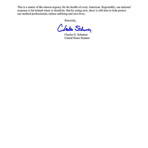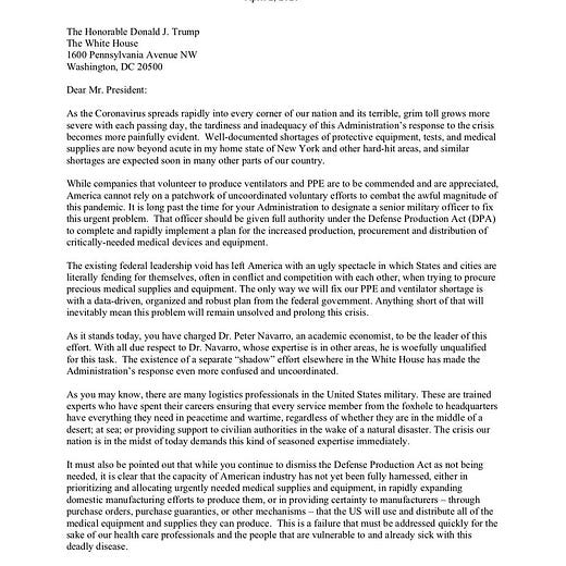 Today Senate Minority Leader Charles Schumer (D-NY) wrote to Trump to urge him to appoint a “senior military officer” as a “czar” to coordinate a federal response to the crisis and to use the DPA to increase production, procurement, and distribution of medical devices and equipment. “America cannot rely on a patchwork of uncoordinated voluntary efforts to combat the awful magnitude of this pandemic,” Schumer wrote. “The existing federal void has left America with an ugly spectacle in which States and cities are literally fending for themselves, often in conflict and competition with each other, when trying to procure precious medical supplies and equipment. The only way we will fix our PPE [personal protective equipment] and ventilator shortage is with a data-driven, organized and robust plan from the federal government. Anything short of that will inevitably mean this problem will remain unsolved and prolong this crisis.”