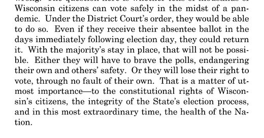 Writing for the four other judges in dissent, Justice Ruth Bader Ginsberg wrote that “the court’s order, I fear, will result in massive disenfranchisement.” “The majority of this Court declares that this case presents a “narrow, technical question”…. That is wrong. The question here is whether tens of thousands of Wisconsin citizens can vote safely in the midst of a pandemic. Under the District Court’s order, they would be able to do so. Even if they receive their absentee ballot in the days immediately following election day, they could return it. With the majority’s stay in place, that will not be possible. Either they will have to brave the polls, endangering their own and others’ safety, or they will lose their right to vote, through no fault of their own. That is a matter of utmost importance—to the constitutional rights of Wisconsin’s citizens, the integrity of the State’s election process, and in this most extraordinary time, the health of the Nation.”