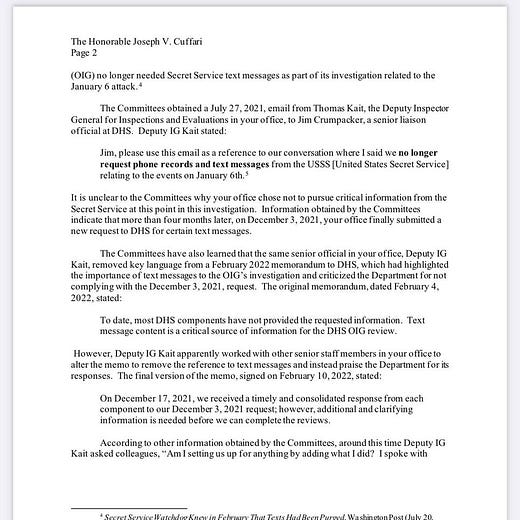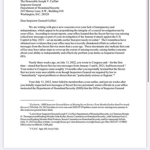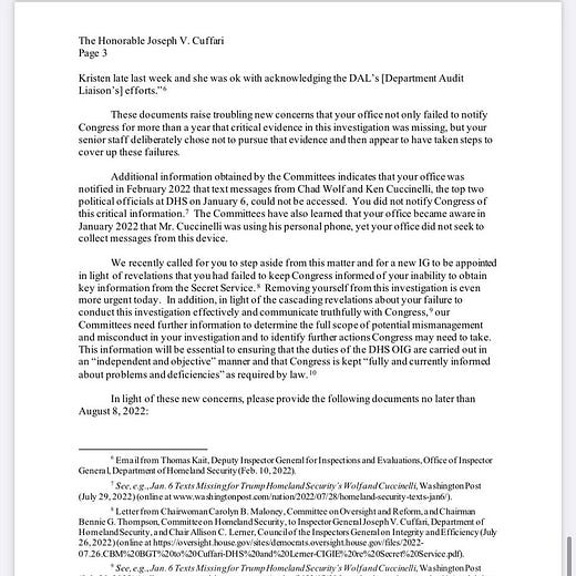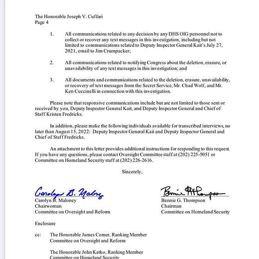 Yesterday, the chair of the House Committee on Oversight and Reform, Carolyn Maloney (D-NY), and the chair of the House Committee on Homeland Security, Bennie Thompson (D-MS), sent a letter to Homeland Security inspector general Joseph Cuffari expressing “grave new concerns over your lack of transparency and independence” in his inspection of the January 6 attack on the U.S. Capitol. Secret Service texts and texts from the two top political officials in the Department of Homeland Security, Acting Secretary Chad Wolf and Acting Deputy Secretary Ken Cuccinelli, were erased, and a memo criticizing the department for not complying with requests for their disclosure was changed to praise their compliance. Maloney and Thompson asked Cuffari to recuse himself from the investigation and to provide them with documents and testimony.