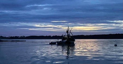 Very beautiful, Buddy, and a tad ominous. The blues of sky with a band of light and water with a shimmer draw me in, particularly the water. That dark mass of boat in the center cuts the scene.