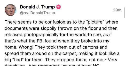 Shortly afterward, Trump tore the ground out from under that argument—and most of the others his supporters were trying to make—by posting a complaint on his Truth Social network about the FBI photo documenting the stolen classified documents. “There seems to be confusion as to the ‘picture’ where documents were sloppily thrown on the floor and then released photographically for the world to see, as if that’s what the FBI found when they broke into my home. Wrong! They took them out of cartons and spread them around on the carpet….”