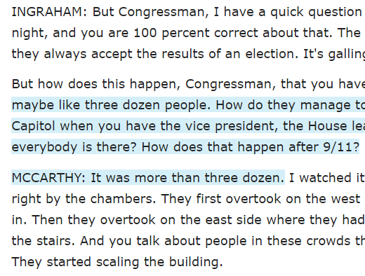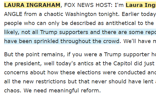Their discomfort might reflect, in part, that they, too, were implicated in the events of January 6. After begging Trump to call off his supporters during the insurrection, the same personalities went in front of their audiences on camera and lied that Trump had nothing to do with the insurrection. Ingraham, for example, blamed Antifa for the attack on the Capitol, suggested the riot was staged by provocateurs, and suggested there were just three dozen people.