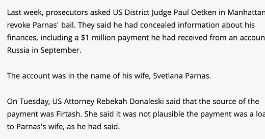 The news kept coming. We knew that Giuliani associate Lev Parnas had concealed from the government $1 million he had received from an account in Russia. Today, US prosecutors told a judge that the source of that money was Dmytro Firtash, a corrupt Ukrainian oligarch associated with the Russian mob. The money went to the account of Parnas’s wife, Svetlana Parnas.