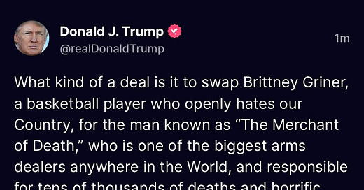 Wow! Trump said Biden could have gotten Whelan out "for the asking." Trump had the opportunity to ask his buddy Putin, but didn't. This one just got to me, just for the pure mendacity and hypocrisy on an issue related to someone imprisoned, after he pardoned all his buddies and got them out of prison sentences. That set into the context of his disgusting comments about Griner's release!