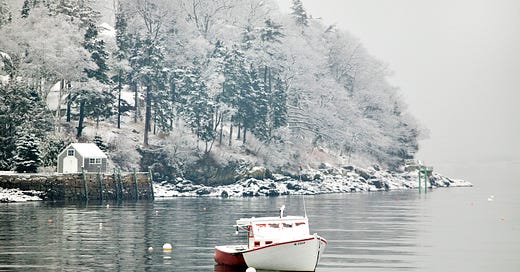 We’re home tonight after a week on the road, coming back to a light snowfall that made everything look like it was tucked into bed for the winter. And now, after an evening of killer cribbage, I’m going to tuck myself into bed, too, probably not for the whole winter, but for many, many hours.