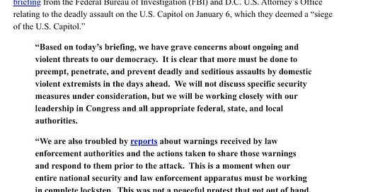 A separate briefing for House Democratic committee chairs seemed to leave them shaken by the scope of the insurgency. “This was not a peaceful protest that got out of hand,” they said in a statement. “This was an attempted coup to derail our Constitutional process and intimidate our duly elected leaders through violence.” “[W]e have grave concerns about ongoing and violent threats to our democracy. It is clear that more must be done to preempt, penetrate, and prevent deadly and seditious assaults by domestic violent extremists in the days ahead.”