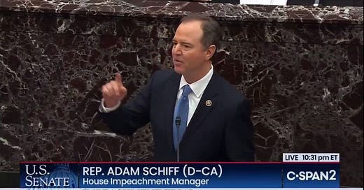 Schiff (D-CA) leads a group of Democratic House managers who are shining in this moment as they weave televised testimony before the House, available documents, and public television interviews into a coherent narrative despite the Senate’s current refusal to admit testimony or documents.