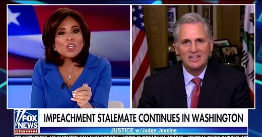 Trump and his team appear to be doing anything they can to harden up his base before an approaching trial… a trial that Fox News personality Jeanine Pirro today suggested to House Minority Leader Kevin McCarthy (R-CA)-- who took Russian money from indicted political operative Lev Parnas (why is he still in office?)-- was no longer viable because the statute of limitations for impeachment had passed. (This is delusional.)