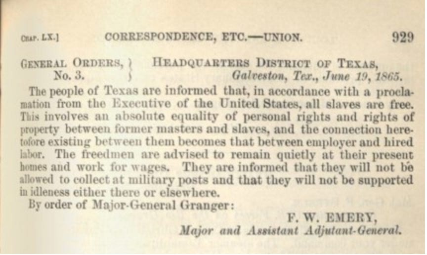 “The people of Texas are informed that, in accordance with a proclamation from the Executive of the United States, all slaves are free,” it read. “This involves an absolute equality of personal rights and rights of property between former masters and slaves, and the connection heretofore existing between them becomes that between employer and hired labor.”