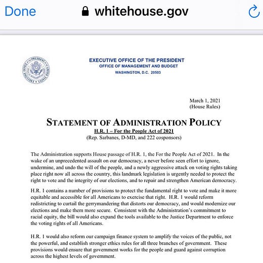 Meanwhile, Democrats are trying to shore up voting rights with H.R. 1, the For the People Act of 2021. This sweeping measure would make it easier to vote, curtail gerrymandering, make elections more secure, and reform the campaign finance system.