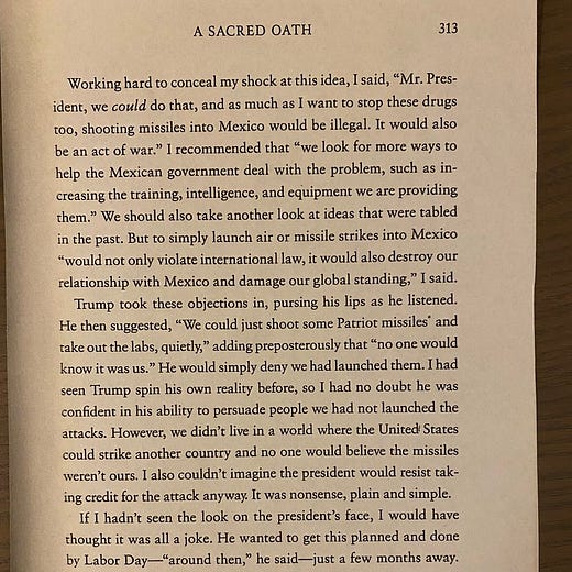 In other news today, a new book coming out by Mark Esper, former secretary of defense under Trump, reveals that the former president wanted the military to recall to active duty retired General Stan McChrystal and Admiral William H. McRaven in order to court-martial them for disloyalty to him. It also says that Trump wanted to have the U.S. military launch missiles at Mexican drug labs, quoting him as telling Esper that “[w]e could just shoot some Patriot missiles” into our neighbor and ally, Mexico, and no one would know it was the U.S. because Trump could just deny it.