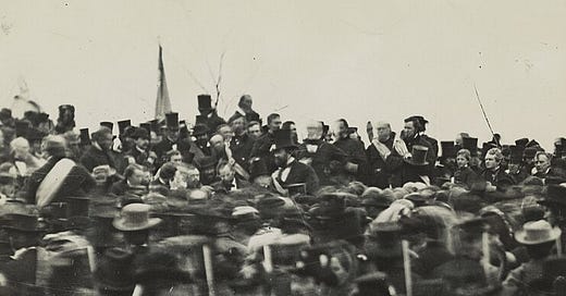 [Image of President Abraham Lincoln at Gettysburg, center-left, with his head tilted downward. Work is in the U.S. public domain, obtained here from Wikimedia Commons.]