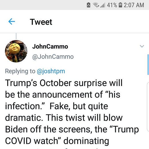 At about 1:30 am on October 2, the White House announced that Trump and First Lady Melania Trump have tested positive for coronavirus. This will be the first time I break my midnight rule—in the past, I have always cut the news off at midnight, no matter what happens at 12:01—but this has such huge implications for national security, the economy, and, of course, the election that it has pushed everything else off the media radar screen and I cannot justify leaving it for a day.