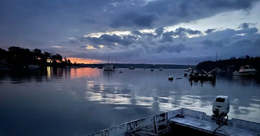 Thank you, Buddy, for the beauty of the sky, shore, and dimly revealed boats on the glimmering water. Thank you, Heather Cox Richardson, for your steady mind through the anguish here in the US; the survival of Ukraine as a democracy; the pain and terror in Israel, along with deaths (many of them children), bloodshed and humanitarian crisis in Gaza. The demands for a keen mind and for moral clarity could hardly be more difficult.