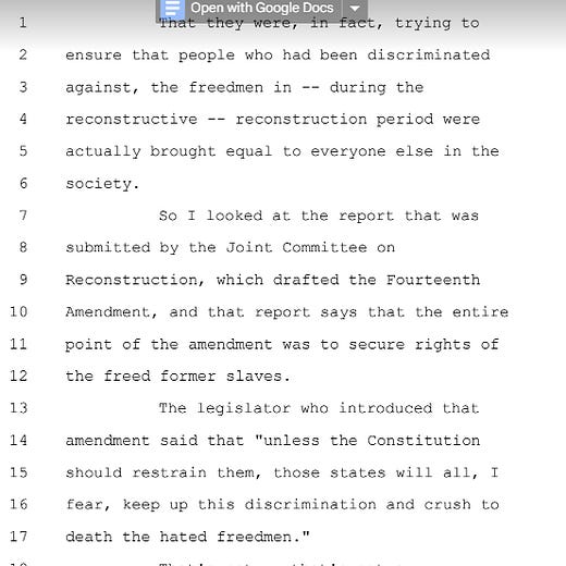 She’s right, of course, and while she followed up with more Reconstruction history, she could have gone even farther: when President Andrew Johnson vetoed the 1866 civil rights bill on the explicit grounds that it was not race neutral (among other things), Congress repassed it over his veto and based the Fourteenth Amendment on it.
