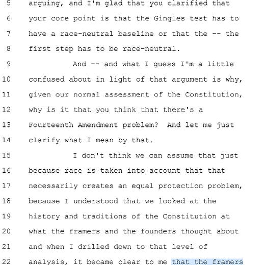 Jackson then turned on its head the so-called “originalism” that has taken over the court. “I understood that we looked at the history and traditions of the Constitution and what the framers and founders thought about,” she said, “and when I drilled down to that level of analysis, it became clear to me that the framers themselves adopted the equal protection clause, the 14th Amendment, the 15th Amendment in a race-conscious way.”