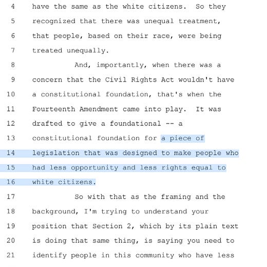 In today’s arguments, Alabama Solicitor General Edmund G. LaCour Jr. claimed that states must draw districts that are “race neutral.” When Justice Jackson pressed him to explain, he turned to the Fourteenth Amendment, saying it “is a prohibition, not an obligation, to engage in race discrimination.”