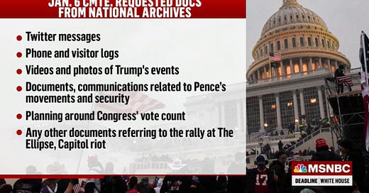 According to MSNBC, those documents include Twitter messages, phone and visitor logs, videos and photos of Trump’s events, all documents and communications related to Vice President Mike Pence’s movements and security, the planning around the counting of the certified votes, and any other documents concerning either the rally at the Ellipse or the Capitol riot.