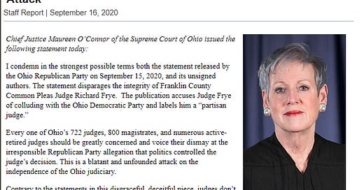 Today, the Chief Justice of the Supreme Court of Ohio, Maureen O’Connor, publicly condemned a statement yesterday by the Ohio Republican Party “in the strongest possible terms.” The statement accused a Democratic judge of colluding with Ohio Democrats to cheat in the upcoming election “to elect radical liberals to fulfill their agenda, including judge with unmistakable partisan interests.” O’Connor called the statement “disgraceful,” and “deceitful.” “The Republican Party’s statement should be seen for what it is: part of a continuing string of attacks against any [court] decision that doesn’t favor a political end, regardless of party, even if that decision may be legally correct and indeed legally required,” she said. The former Lieutenant Governor of Ohio, O’Connor is a Republican.