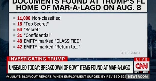 Today the unsealing of a court filing revealed that the August 8 search turned up more than 11,000 documents or photographs that were not classified, 31 documents marked CONFIDENTIAL, 54 marked SECRET, and 18 marked TOP SECRET. In addition, agents found 48 empty folders marked CLASSIFIED, and 42 empty folders marked to be returned to a military aide. Those documents were not filed with the envelopes.