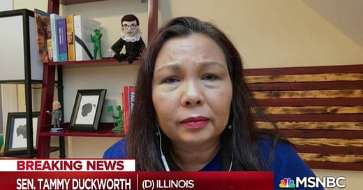 Since at least 2018, Democrats, especially Democratic women, have advanced a vision of military service that departs from the Republican emphasis on heroic individualism. Instead, they emphasize teamwork, camaraderie, and community, and the recognition that that teamwork means every single soldier, not just a few visible heroes, matters. Today Duckworth, who lost both her legs and some of the use of her right arm in 2004 when her helicopter was shot down, told NBC’s Nicolle Wallace: “When somebody goes into combat they need to know that their buddies to their left and to their right will not leave them behind no matter what. We will get you out of there even if it is just bringing your body home…. When I was wounded, my crew thought that I was dead... but they risked their lives to retrieve my body... and they carried my body through that field in Iraq, covered themselves in my blood and my flesh and got me to that rescue aircraft. And only then did they discover that I was still alive. It was because these men and women stand up for the values that they fight for."